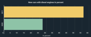 The proportion of new passenger cars sold with diesel engines has shrunk to 27.2% in Germany. As recently as 2011, more than half of all vehicles were diesels, according to a new infographic from Kryptoszene.de. In the same period, the prices for new passenger cars has risen considerably.