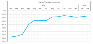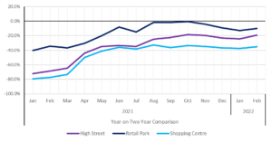 - Footfall on High Streets declined by 19.4% in February (Yo2Y), 4.8 percentage points better than last month’s rate, and an improvement on the 3-month average decline of 22.4%.